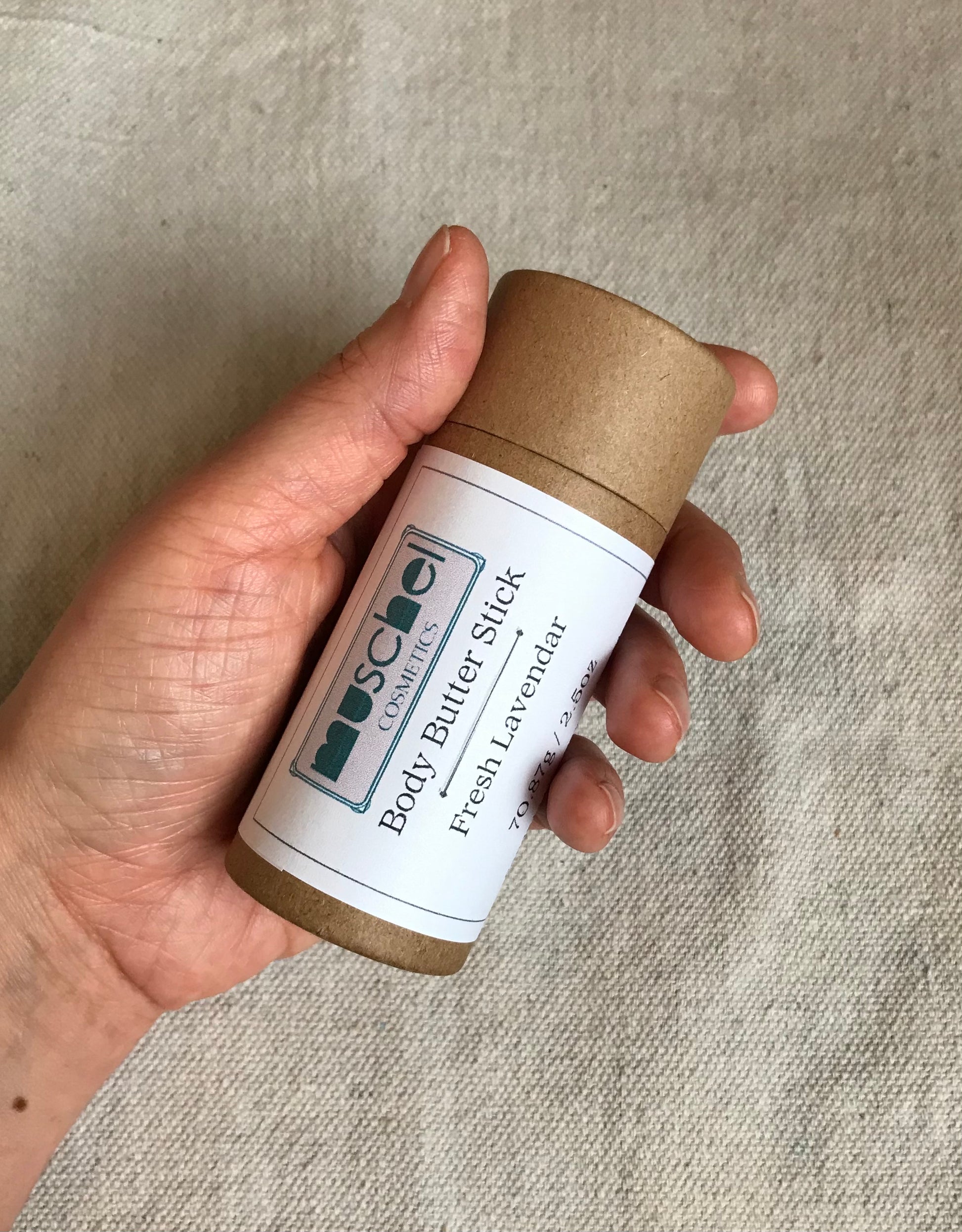 To Use: Push up the paper tube from the bottom. Glide body butter stick across dry spots of the body and massage into the skin.